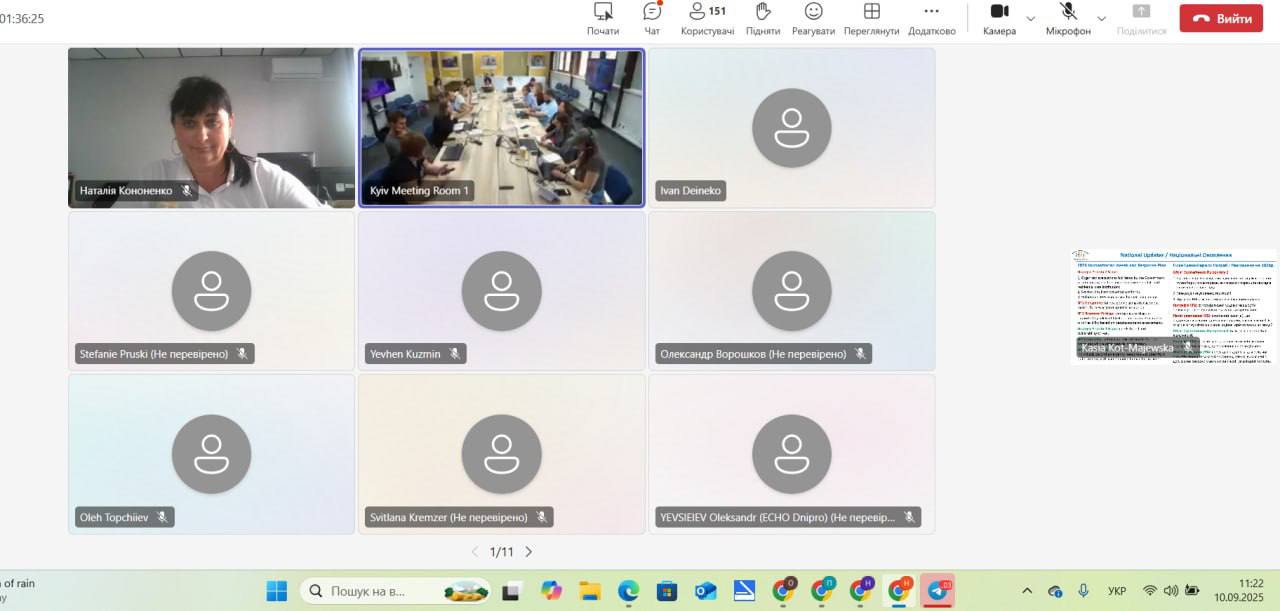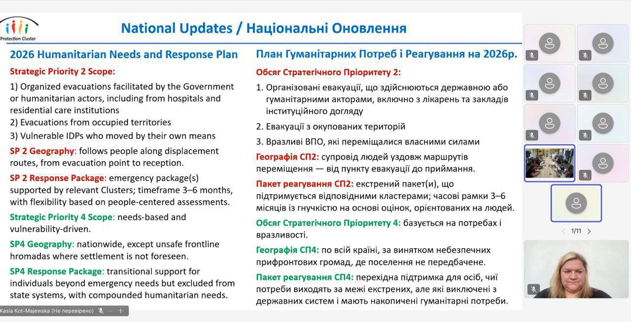 Також розглядали питання щодо стратегічних оновлень Національного Кластера захисту та партнерів, план гуманітарних потреб та реагування та розподіл коштів Гуманітарного фонду для України, оновлення даних щодо транзитних центрів та місць колективного проживання (CCCM).