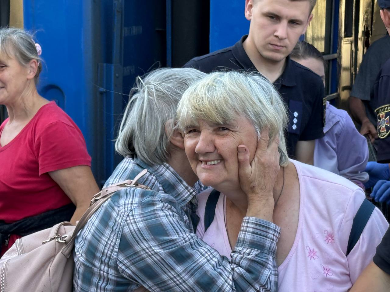 На першому фото – пані Ніна обіймає свою рідну сестру Любов. Вона та ще одна сестра — Наталя — сьогодні приїхали евакуаційним поїздом із Донеччини.