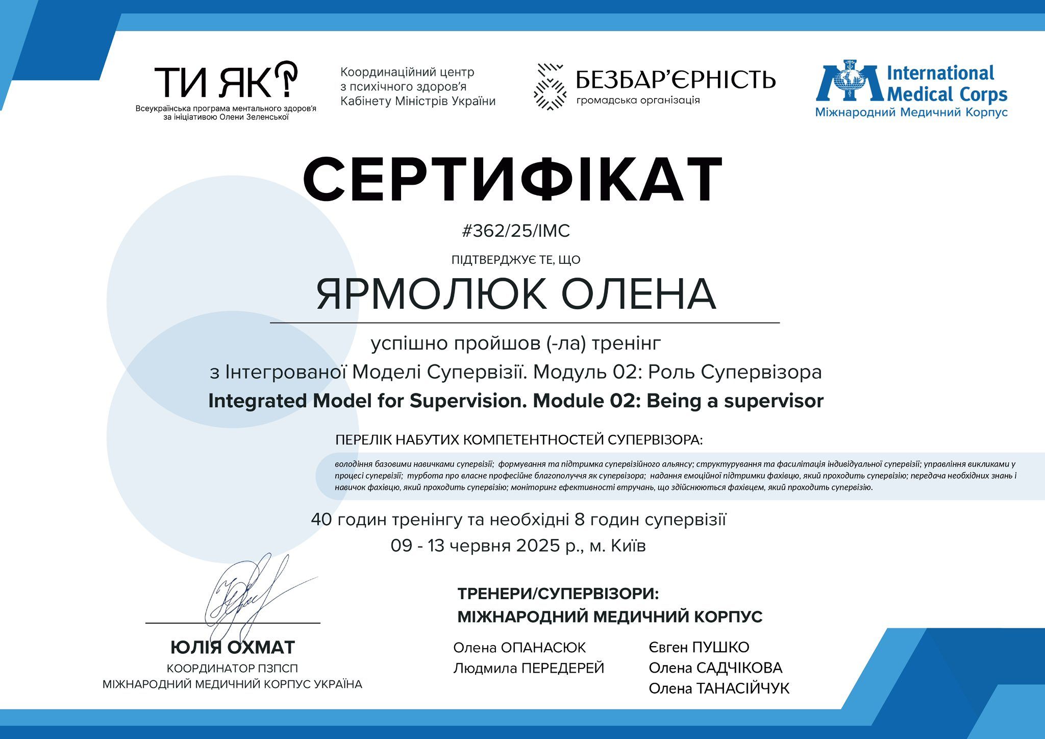 Щиро дякуємо тренерській команді за високий професійний рівень і системний підхід до розвитку супервізії в соціальній сфері.